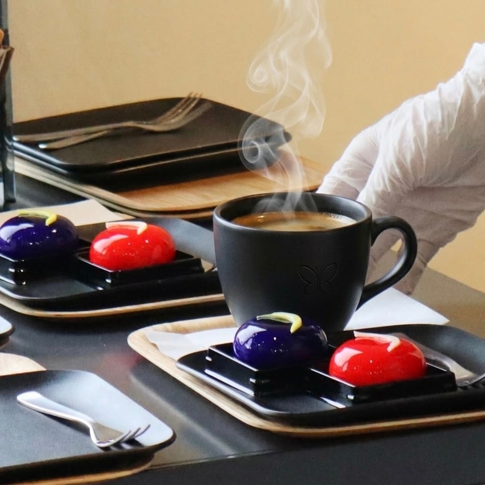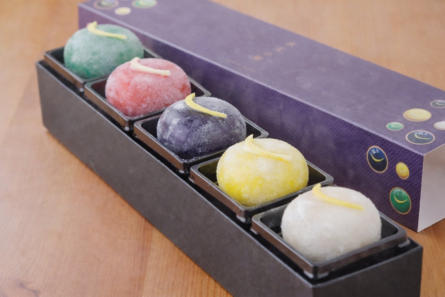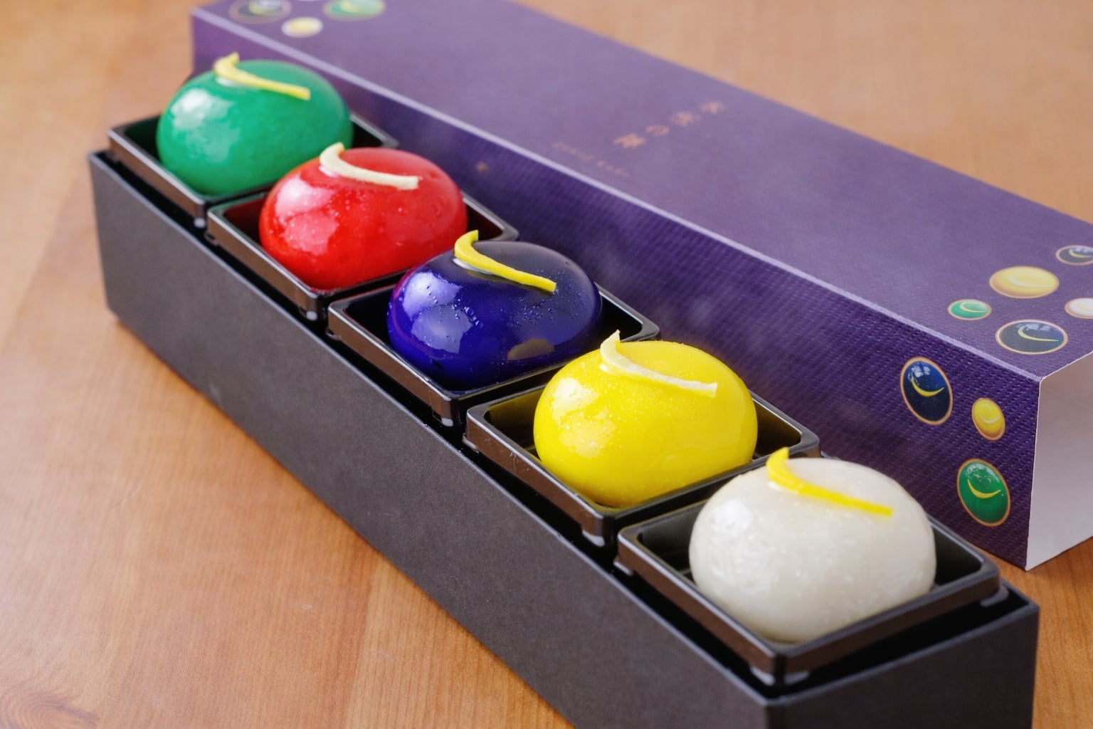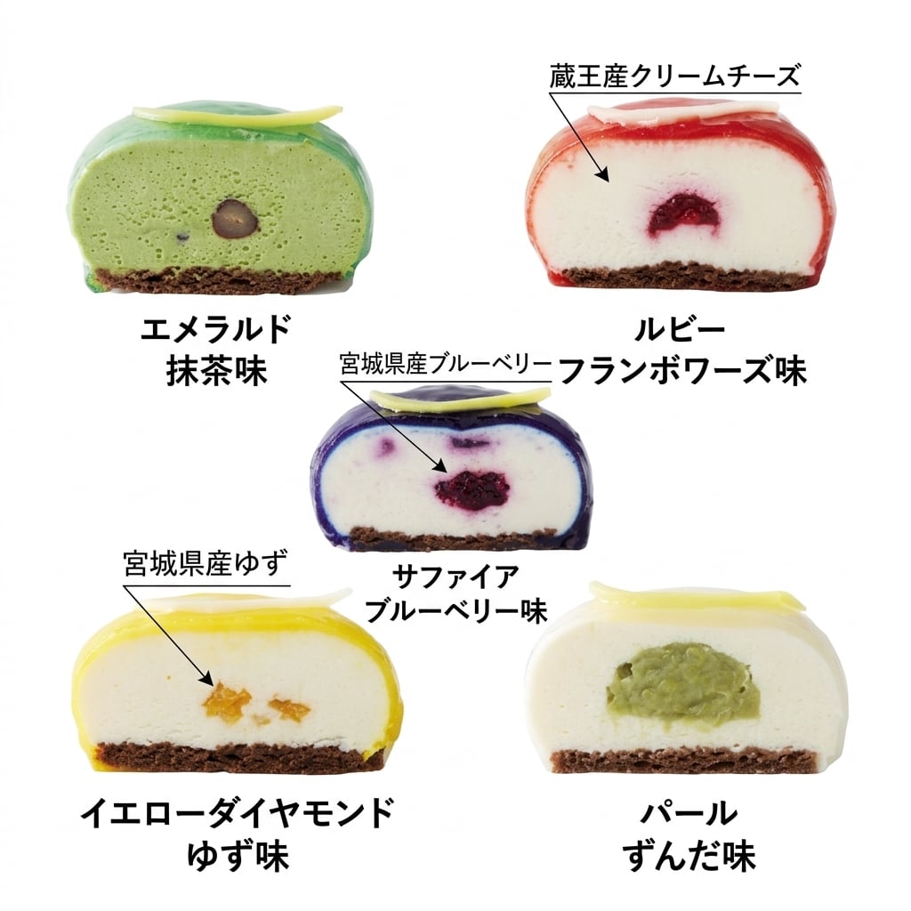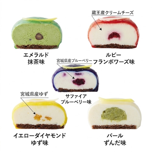 日本航空 国内線ファーストクラス機内食のスイーツとして採用され、大手百貨店でも好評をいただいている「レッドジュエル」「神秘のエメラルド」「ブルージュエル」。